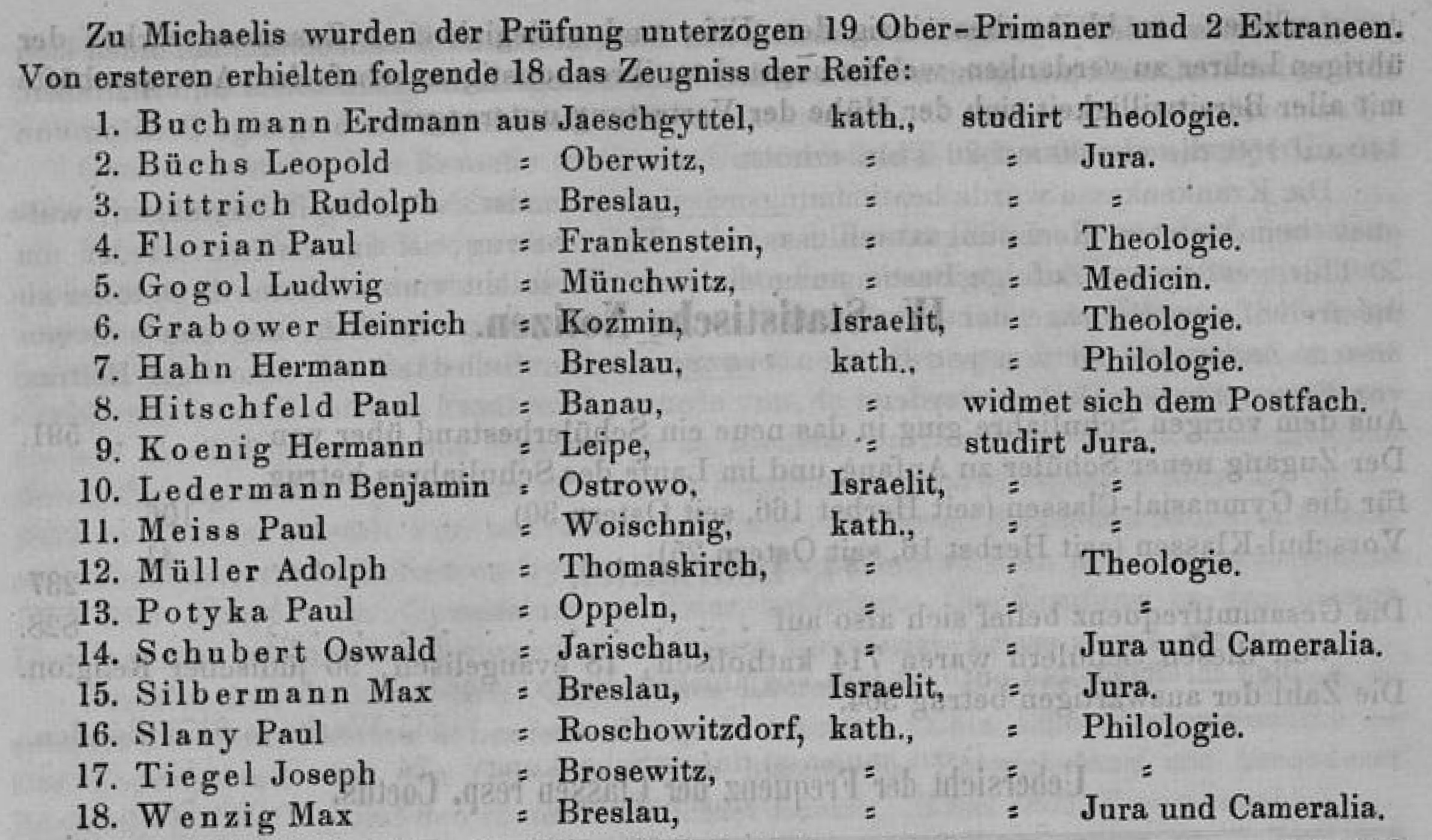Graduates of the class of 1868 (from: Jahresbericht über das königliche katholische St. Matthias-Gymnasium für das Schuljahr 1867–1868. Breslau 1868, p. 28).