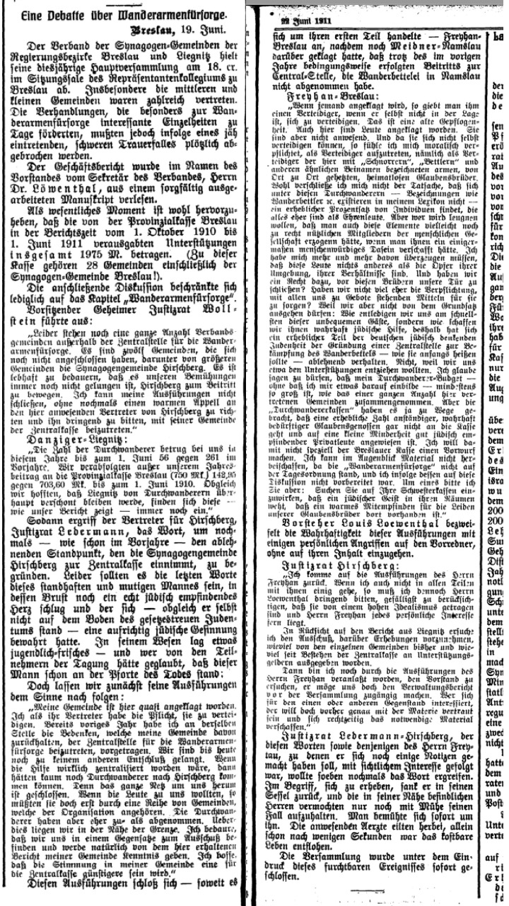 law-abiding Judaism—had preserved a genuinely Jewish attitude … [this is followed by an excerpt from his speech, as well as those of other speakers] … Justizrath Ledermann of Hirschberg, who had followed these words with visible interest, was just about to take the floor once more. As he was about to rise, he sank back into his chair, and the gentlemen near him were only barely able to break his fall … The physicians present hurried over, but after only a few seconds the precious life had already fled”. The meeting was not resumed until November 1911.