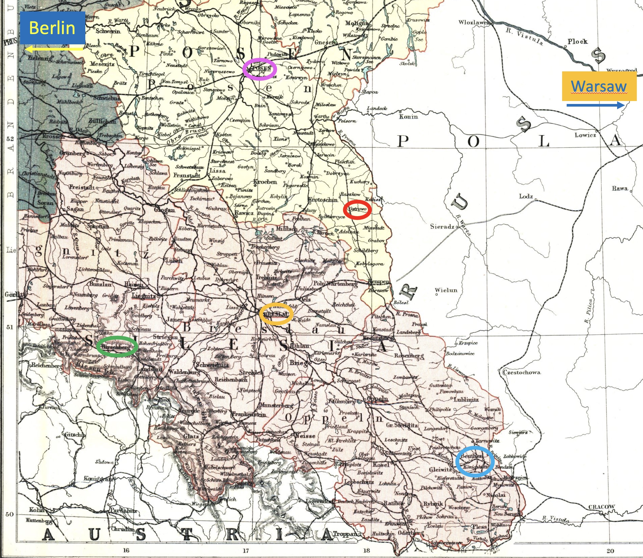 Map of the provinces of Posen and Silesia in the German Empire from 1875 (public domain). Marked in color are the towns of Posen, Ostrowo, Breslau, Beuthen, and Königshütte, as well as Hirschberg.