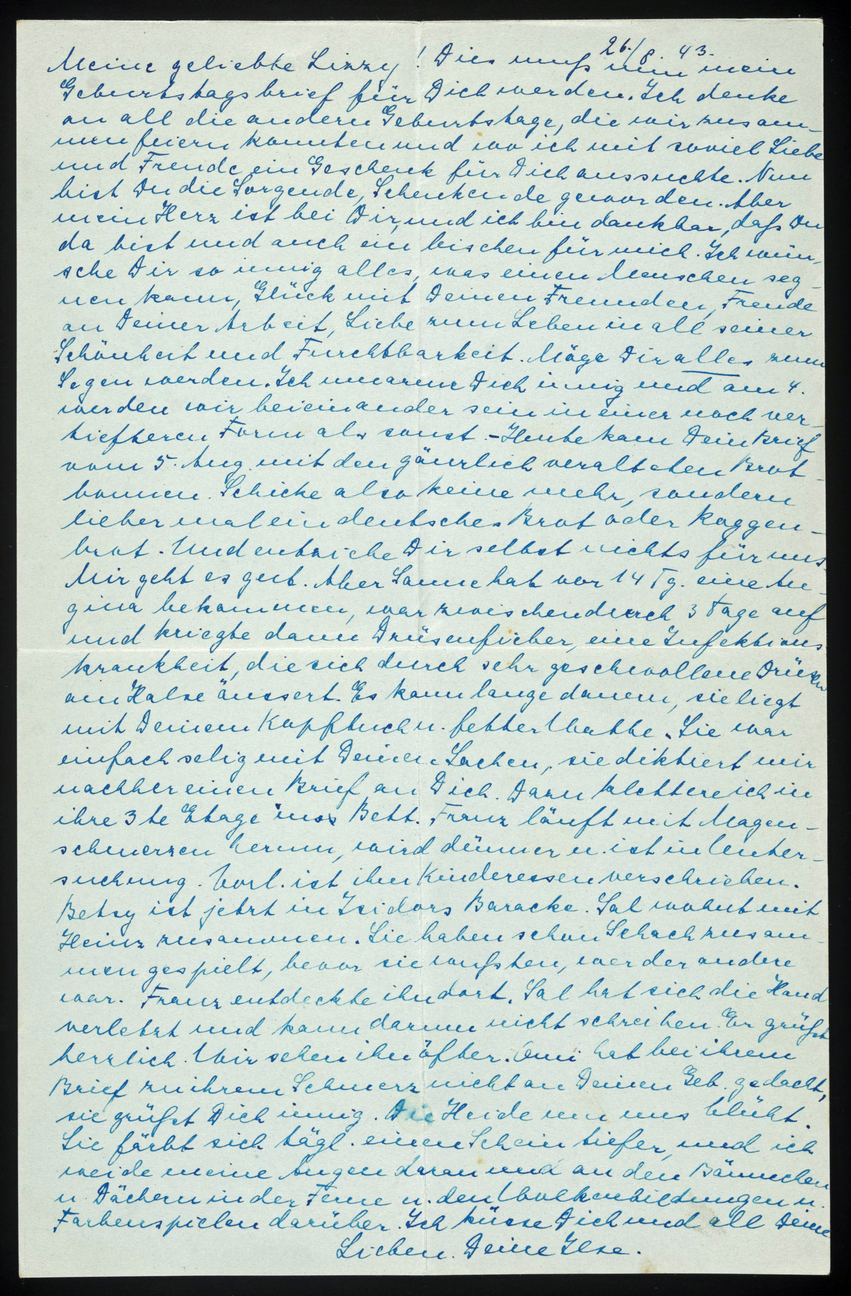 ... kaum lange daueren, sie liegt mit Deinem Kapfluchen fetter ... Sie war einfach selig mit Deinen Sachen, sie diktiert mir nachher eienen brief an Dich. Dazu ... ich in ihre 3 ... uns Bett. Franz läuft mit ... schmertzen herum, ... ... er ist ... Untersuchung. ... ist ihrer Keinderessere verschrieben. Betsy ist jetzt in Zeidors Baracke. Sal arbeit mit Heinz zusammen. Sie haben schon Schach ... ... gespielt, bevor sie ... ... der andere ... Franz entdeckte ihn dort. Sal hat sich die Hand verletzt und kann darum nicht schreiben. Er grüsst herzlich. Wir sehen ... öfter. Ommi .. bei ihrene Brief zi ihrener ... nicht an Deinen geburtstag gedacht, sie grüsst Dich innig. Die Heide .. .. blüht. Sie f"rbt sich täglich ... schein tiefer und ich ... zi eine ... daran werd aus dein Bä... und Dächern in der Ferne und den ... und Farheuspielen darüber. Ich küsse Dich and all Deine Lieberen