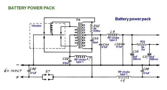 The system could alternatively be powered from a 6 Volt battery, using a vibrator to generate HT. The RF chokes are presumably sized to carry the currents required - around 3A for the type 1 and 100mA for type 2. The 3 Watt rating for R33 seems too low -25 mA receiver current would give a dissipation of 3,1 Watt.