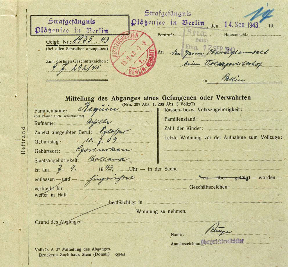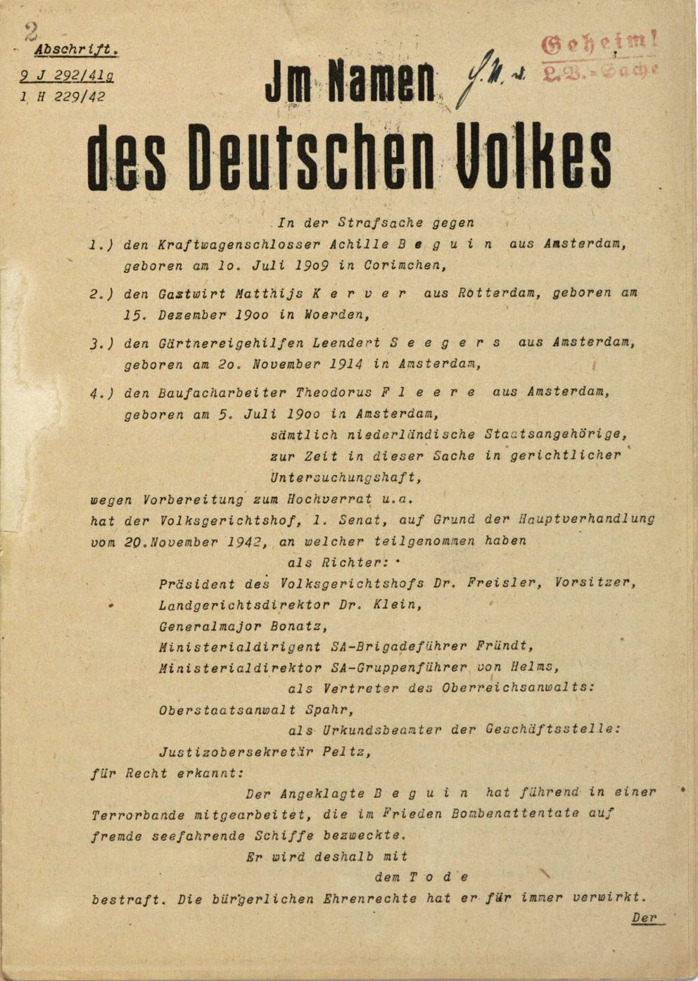 Nach seinem Spanienaufenthalt geht Achille Beguin in die Niederlande zurück. Er hat mehrere Treffen mit Vertretern der Wollweber-Gruppe und nimmt in Rotterdam bald eine führende Position ein. Im August 1939 wird er zur Marine einberufen und nach der Kapitulation der Königlich-Niederländischen Streitkräfte am 15. Oktober 1940 festgenommen. Am 20. November 1942 verurteilt der „Volksgerichtshof” ihn wegen „Vorbereitung zum Hochverrat” zum Tode. Sein Gnadengesuch wird abgelehnt und Achille Beguin während der sogenannten Blutnächte am 7. September 1943 im Strafgefängnis Berlin-Plötzensee ermordet.
