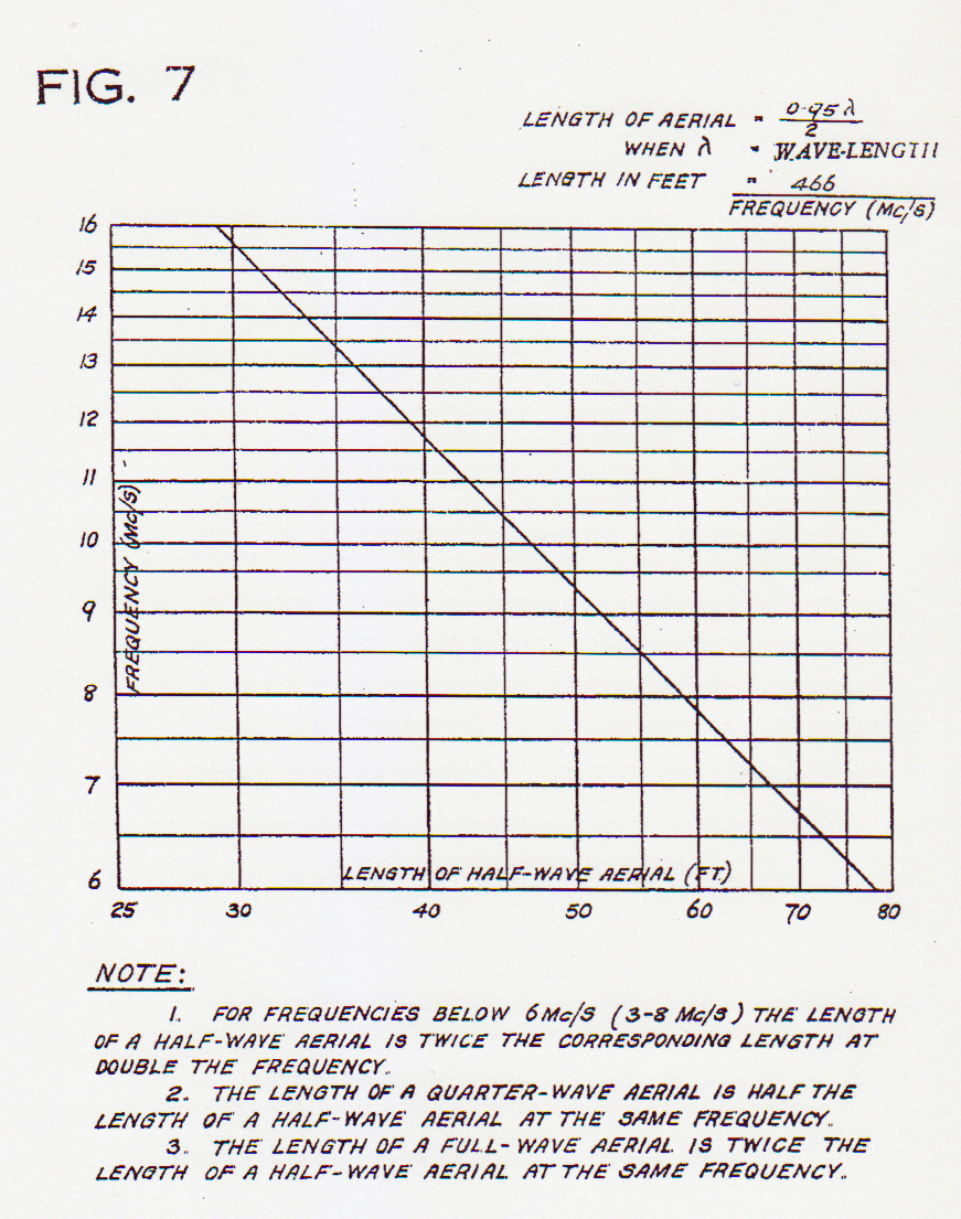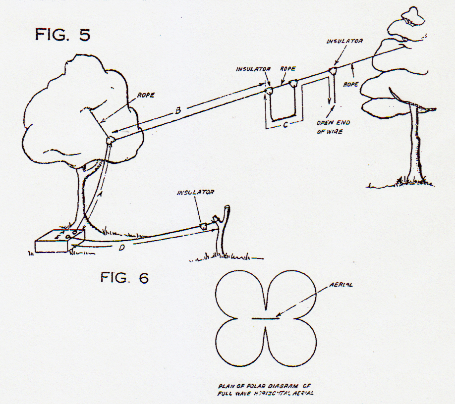 It frequently happens when using high frequencies that a full wave length aerial can be conveniently erected. It should be noted that a full wave length aerial is markedly more directional than shorter aerials and has four main lobes. It should not, if at all possible, be erected so that its length is at right angles to the direction of transmission but should preferably be arranged so that it lies in a plane approximately 45° to the desired direction of transmission. Although the propagation from the ends is low, that is the transmission is weaker in the directions along the length of the aerial, the drop in power is not so great as in direction at right angles to the aerial, especially at distances under 500 miles. (see Fig.6)