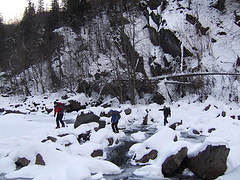 Vijf uur later kwam hij terug met de mededing dat het ijs aan het kruien was, maar dat men de rivier op één bepaald punt nog over kon steken. Hij was er van overtuigd dat men de steile hellingen kon beklimmen ondanks het gewicht van de rugzakken die gevuld waren met explosieven, wapens en andere uitrusting.