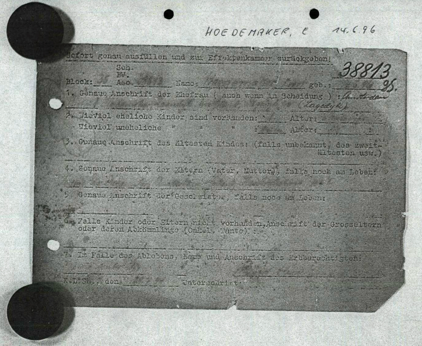 Administratiekaart Evert Hoedemaker KZ Sachsenhausen.