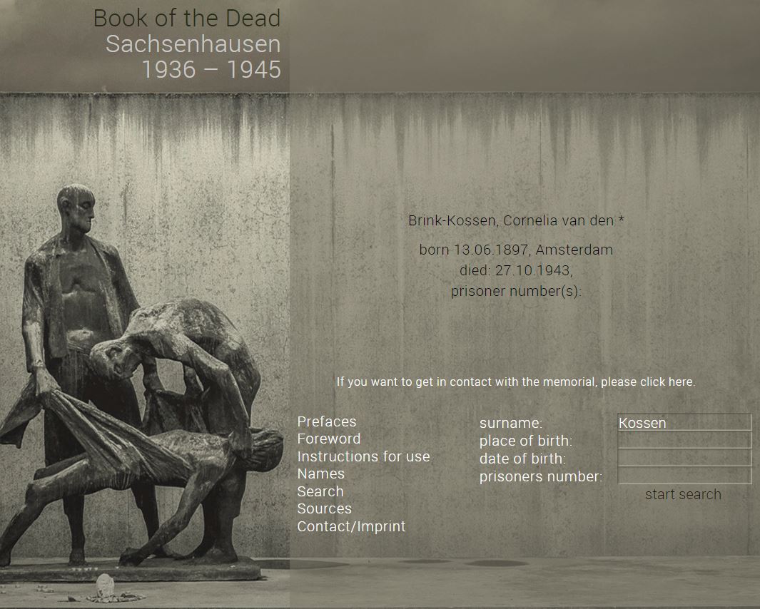 KOSSEN, Cornelia, vooral bekend als Nel Hissink (geb. Amsterdam 13-6-1897 - gest. Oranienburg, Duitsland 27-10-1943), actief in het verzet. Dochter van Willem Kossen (1833-1901), varensgezel, en Dina Lena Bartholomina Anna Korthals (1856-1926). Cornelia Kossen trouwde op 27-5-1920 in Laren met Johan Clasinus Adrianus van den Brink (1896-1984), boekhouder; (2) had vanaf 193? een relatie met Coen Hissink (1878-1942), acteur en schrijver. Uit huwelijk, dat in 1935 in Djakarta werd ontbonden, werden 2 dochters geboren.