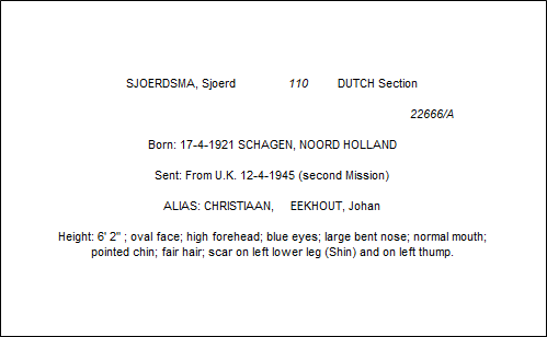2/Lt Sjoerd SJOERDSMA was parachuted into enemy occupied Holland on the 2nd January 1945 to act as W/T operator and ensure commications between the U.K. and the H.Q. of organised Resistance in the OVERIJSSEL area of Easter Holland.