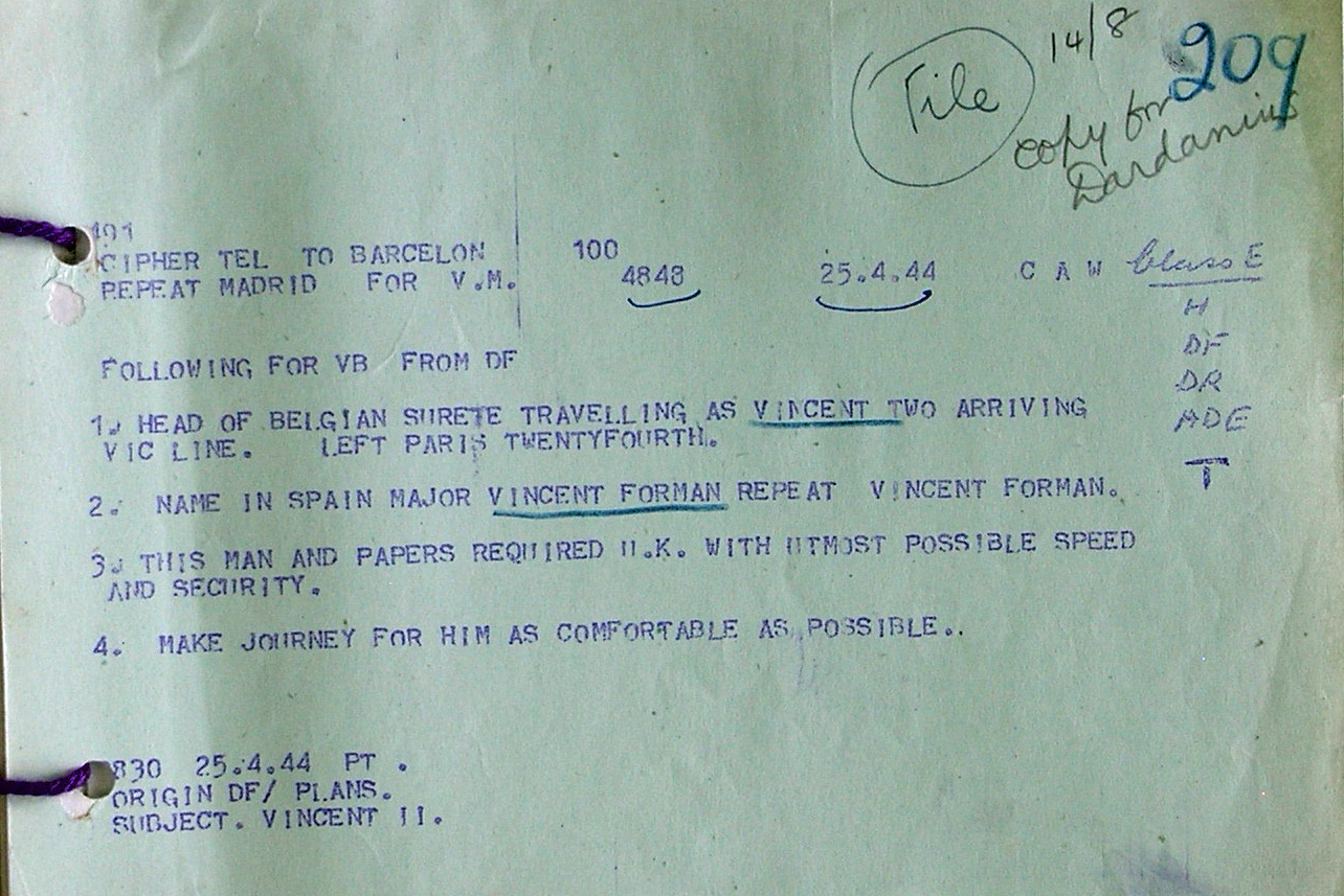 Londen informeert Barcelona dat Ides Floor op 24 april 1944 Parijs heeft verlaten. Hij gebruikt de schuilnaam VINCENT FORMAN, missienaam is DARDANIUS.
